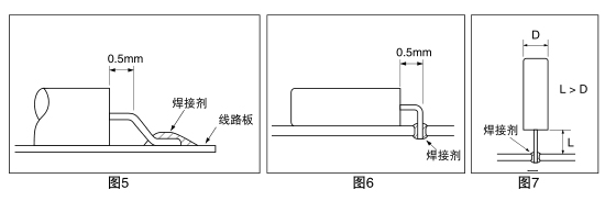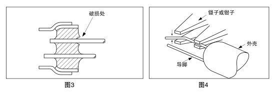 (1) 將導(dǎo)腳彎曲之后并進行焊接時,導(dǎo)腳上要留下離外殼0.5mm的直線部位。如果不留出導(dǎo)腳的直線部位而將導(dǎo)腳彎曲,有可能導(dǎo)致玻璃的破碎(參閱圖5和圖6)。